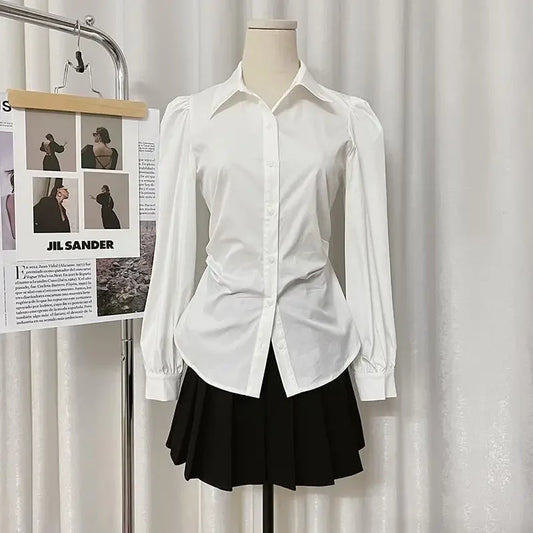 Chemise Blanche Ajustée pour Femme avec Manches Ballons et Taille Marquée