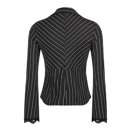 Haut Noir à Rayures Blanches avec Manches Évasées et Détails Dentelle