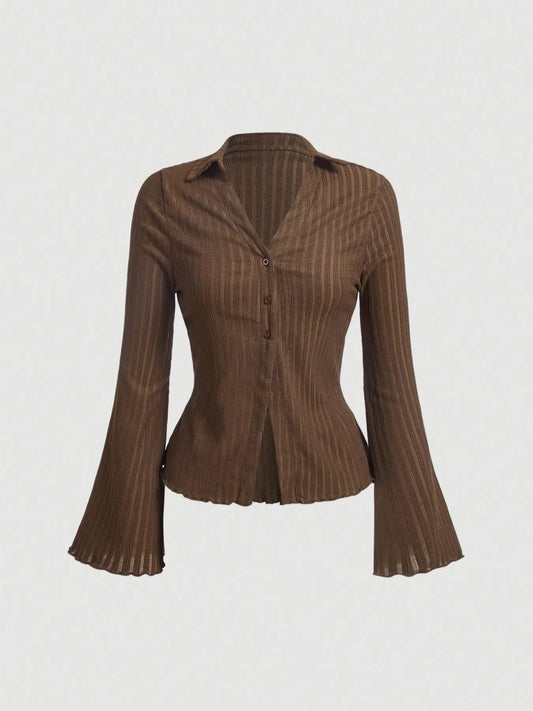 Chemisier Cintré à Mailles Nervurées Marron avec Manches Évasées